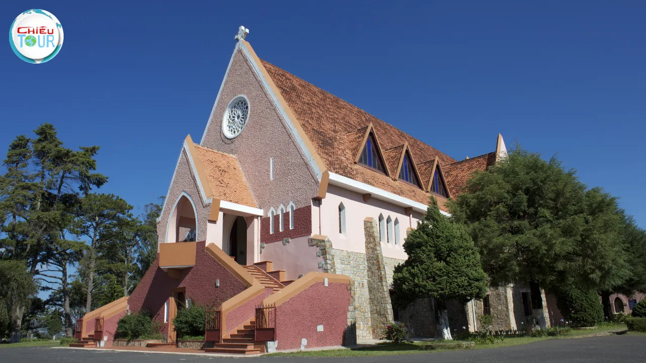 NHÀ THỜ DOMAINE DE MARIE – còn được biết đến với tên gọi Nhà thờ Mai Anh – là công trình tôn giáo cổ kính mang đậm phong cách kiến trúc châu Âu thế kỷ XX. Nhà thờ nổi bật với gam màu hồng đặc trưng, mái ngói đỏ và khuôn viên rợp bóng hoa cỏ. Không chỉ là điểm sinh hoạt tôn giáo quan trọng của người dân địa phương, Domaine de Marie còn là địa điểm check-in nổi tiếng, mang đến cho du khách cảm giác bình yên và lãng mạn rất riêng của Đà Lạt.