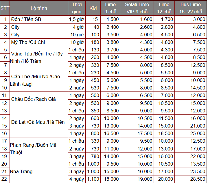 2. Bảng giá cho thuê Xe Limousine ở TPHCM mới nhất